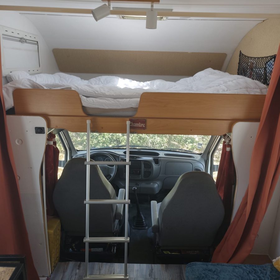 En effet ce camping-car a été transformé et conçu pour deux personnes. Vous allez pouvoir profiter pleinement de son grand espace de vie avec un salon comprenant une banquette longitudinale pouvant y accueillir jusqu’à trois personnes, d’une cuisine fonctionnelle équipée de son frigo et de sa plaque de cuisson ( 2 feux ), d’un grand bac à douche pouvant y accueillir jusqu’à deux personnes, de nombreux rangements pour y installer toutes vos affaires confortablement et ces toilettes sèches séparées.