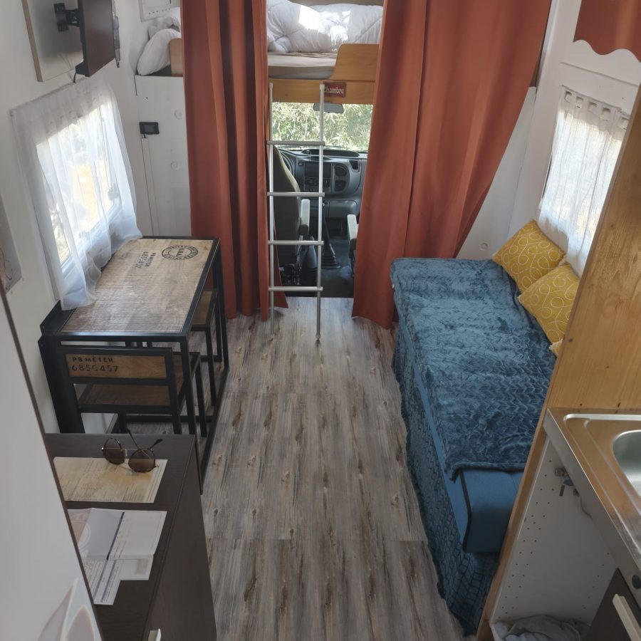Ce camping-car Capucine saura séduire les amoureux de grands espaces intérieurs grâce à sa transformation particulière et sa configuration atypique.